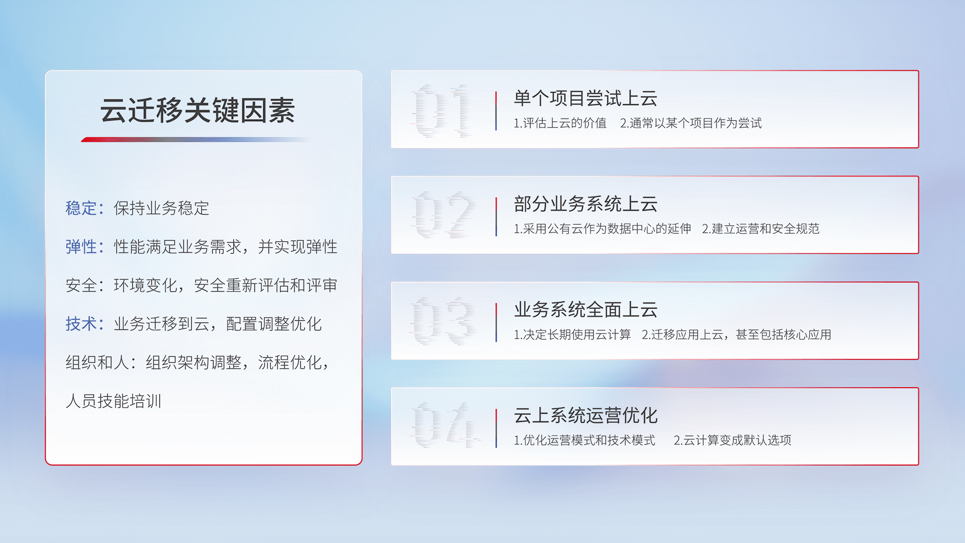 结合实际业务,,,,从规划设计、、、、云平台选型、、、云原生改造、、、数据迁移、、、集成交付,,,,迁移全过程为客户识别最佳上云路径,,,做好风险识别管理,,,设计网络架构、、、身份权限、、、、安全审计合规、、、操作审计、、日志审计、、、监控告警策略、、、多站点容灾设计等,,对云上基础设施进行整体规划,,,提升IT治理水平,,,,以满足弹性、、、高可用、、高性能的需求。。。