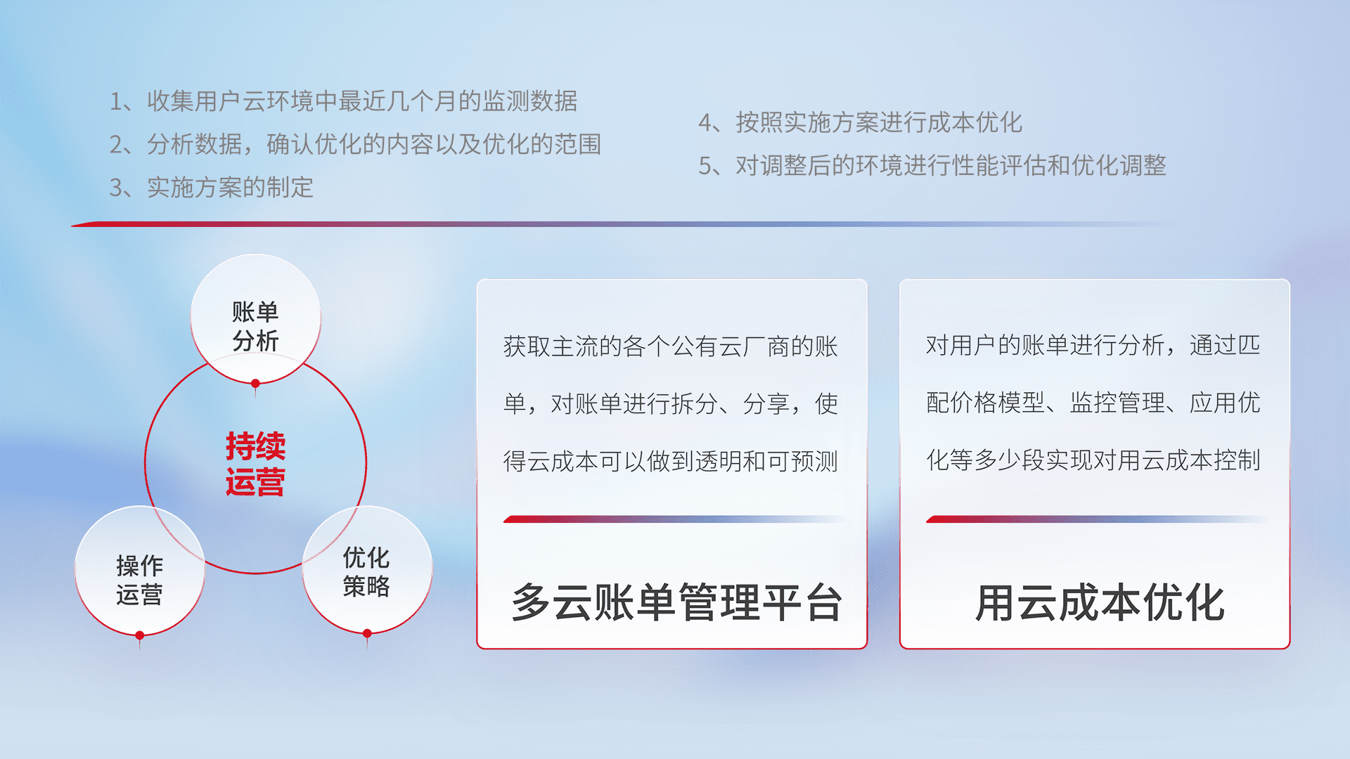 通过多云纳管,,以统一的资源数据模型把客户的云资源进行抽象和封装,,,,进而实现对多云资源的统一操作,,,,保障云资源管理的可靠性、、稳定性与可用性。。。量身定制化运维内容,,,配置、、、开发运维、、补丁管理、、、、备份、、、监控、、、、认证和访问管理、、审计和日常巡检等,,,保障在用云过程中的可靠度,,稳定度以及高可用率。。