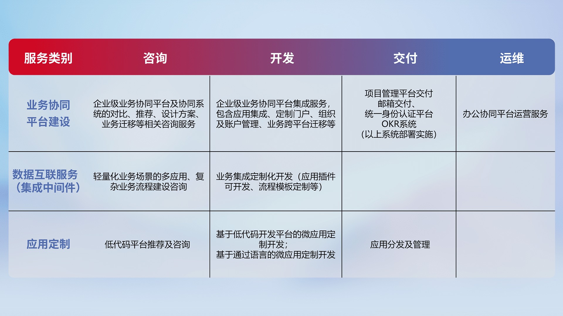 针对钉钉、、企微、、、、IDaas等平台级产品提供产品的规划、、、、方案、、交付、、定制化开发等服务,,,实现如统一协同办公、、智能客户服务、、、、混合会议管理、、、、智能数据查询、、、等业务场景,,,实现数字化转型。。